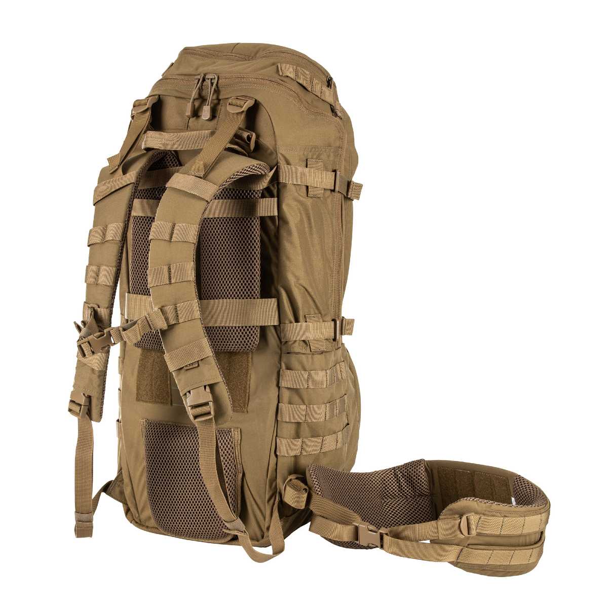 - Removable padded waist belt with web MOLLE for gear attachment: S/M 30"-36" Hip, L/XL 35"-45" Hip