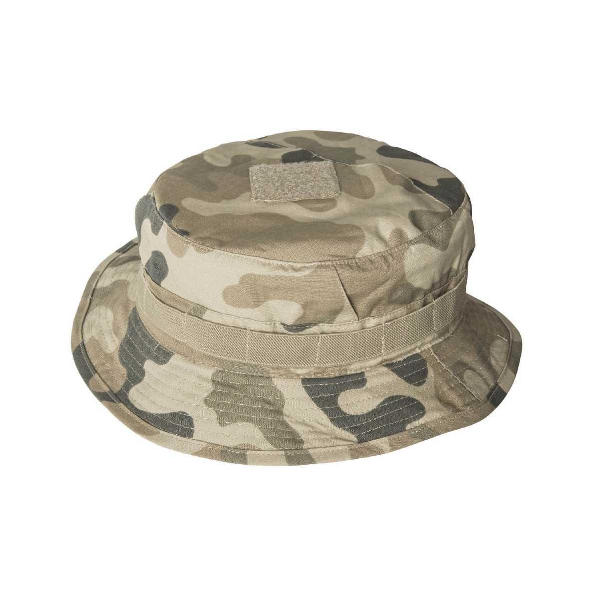 Military hat of characteristic design with narrow and adjustable brim, in British/Australian style. Circumference is adjustable to fit head size. Traditional metal vents were replaced with hidden mesh tunnels (at sides and in top), enhancing the air circulation. Sweatband enhances comfort and prevents sweat from accumulating on the forehead. Designed for mostly forest operations. Provides effective head camouflage.