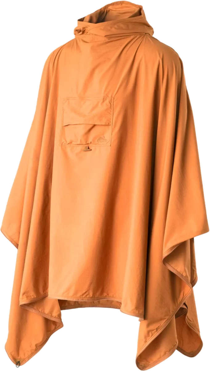 - Unfolded, it becomes a poncho with a hood, and with the sides fastened it doubles as a lightweight jacket.