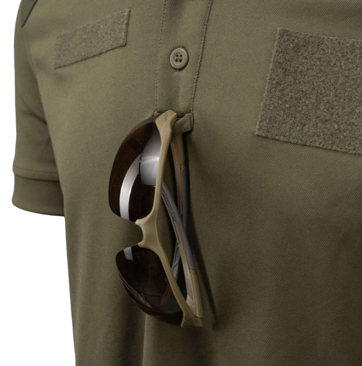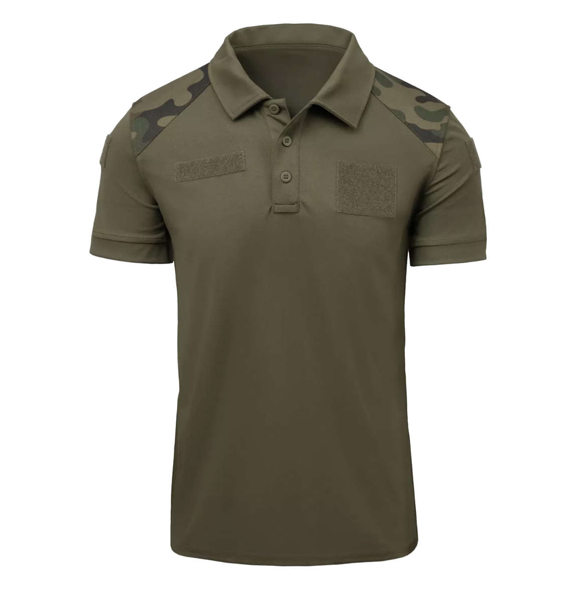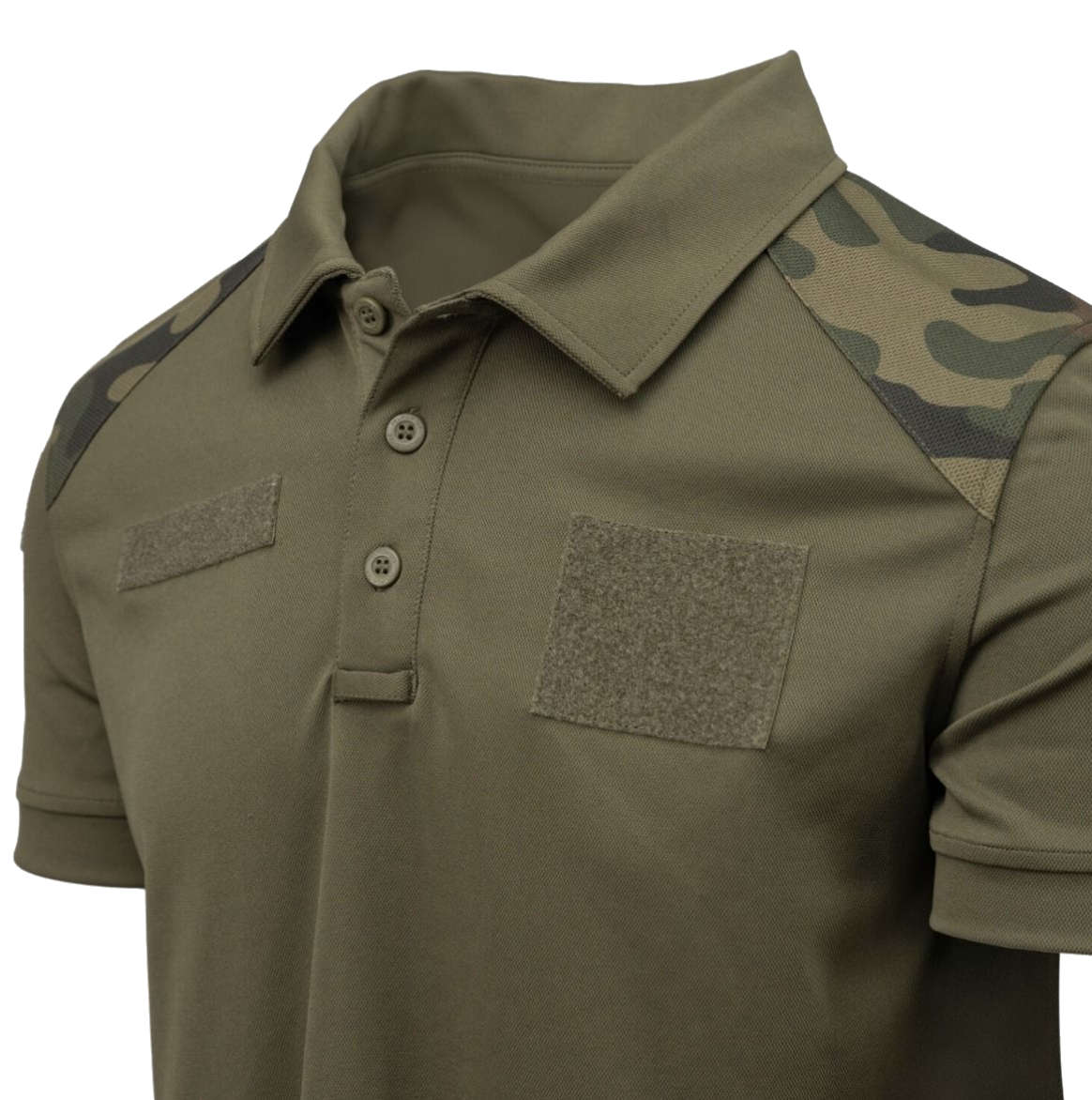 Our polo shirt features PL Woodland camouflage inserts on the shoulders, making it suitable for a field uniform. Additionally, the shirt includes hook&loop panels: two on the sleeves (for national insignias) and two on the chest (for rank patches and name tags). The button placket is finished with a practical loop for securing sunglasses.